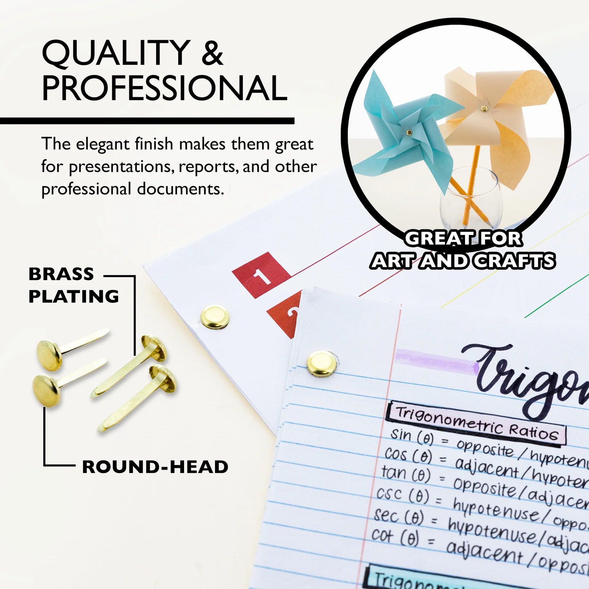 • PROFESSIONAL. Brass plating and round-head design adds a professional and polished appearance to documents. The elegant finish makes them great for presentations, reports, and other professional documents.