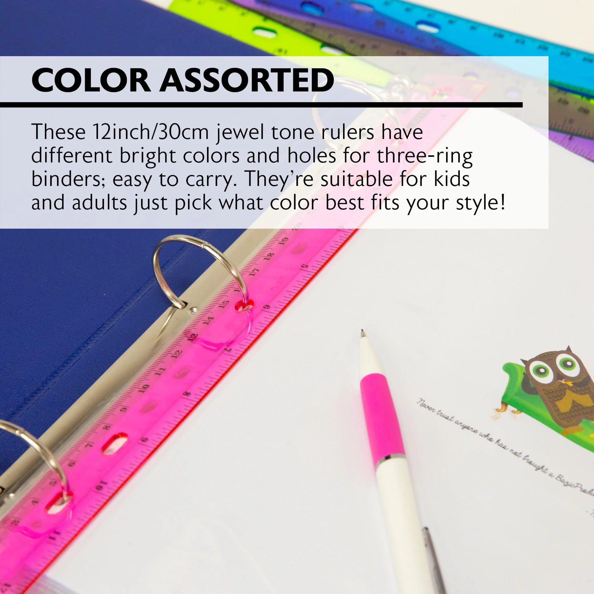 • COLOR ASSORTED. These 12inch/30cm jewel tone rulers have different bright colors and holes for three-ring binders; easy to carry. They're suitable for kids and adults just pick what color best fits your style!
