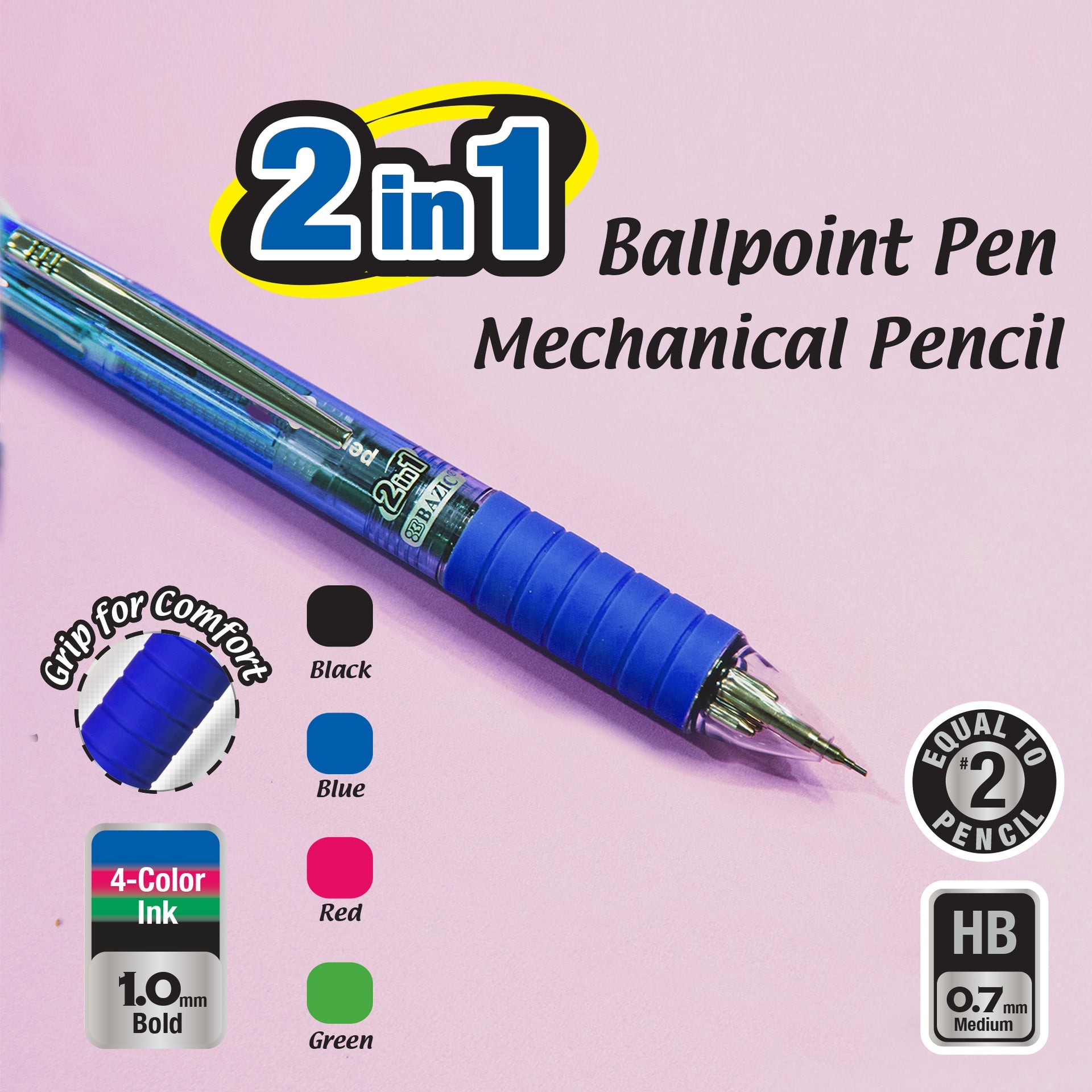 - 2-IN-1 MECHANICAL PENCIL & 4-COLOR PEN. Be ready for any writing task with BAZIC's 4-Color 2+1 Ball Pen and Pencil. Barrel colors come in assorted colors