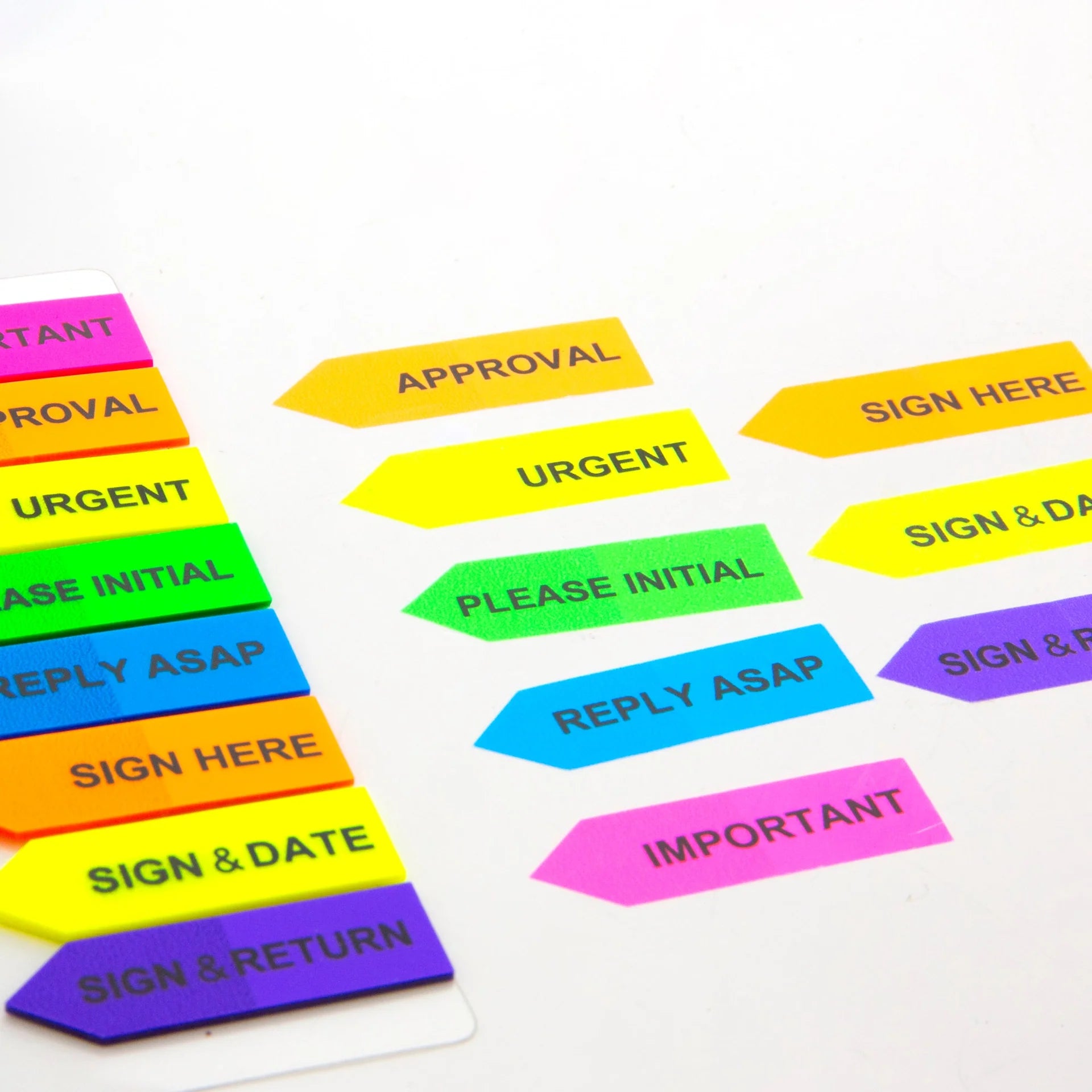 - UNLIMITED USES. Pre-printed with IMPORTANT, APPROVAL,URGENT, PLAESE INITIAL, REPLY ASAP, SIGN HERE, SIGN & DATE, SIGN & RETURN. Express yourself in color for your communication needs.