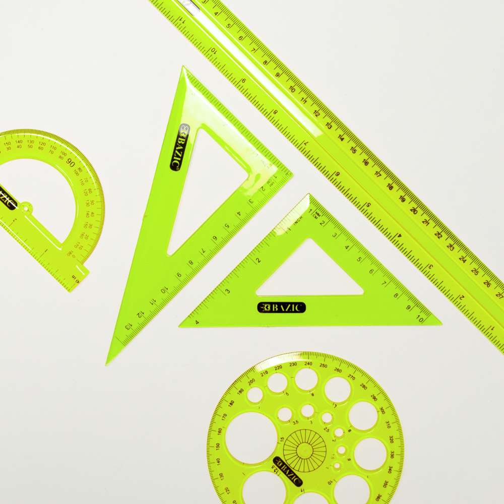 - MATH GEOMETRY KIT 5 PIECES. 12" (30 cm) ruler + 4" (10.2 cm) 30/ 60/ 90 degree triangle ruler + 3.25" (8.25 cm) 45/90 degree triangle ruler + 4" (10.2 cm) 180 protractor + 360 degree Compass ruler