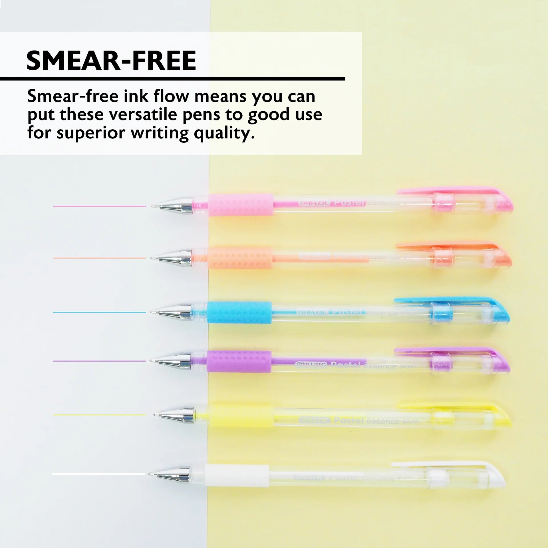 • ESSENCE PASTEL GEL PENS. Pastel Gel Pens come in an assortment of 6 colors; Actual Colors May Vary! Fulfill all your coloring and writing needs! They're great for taking the dullness out of classroom notes.