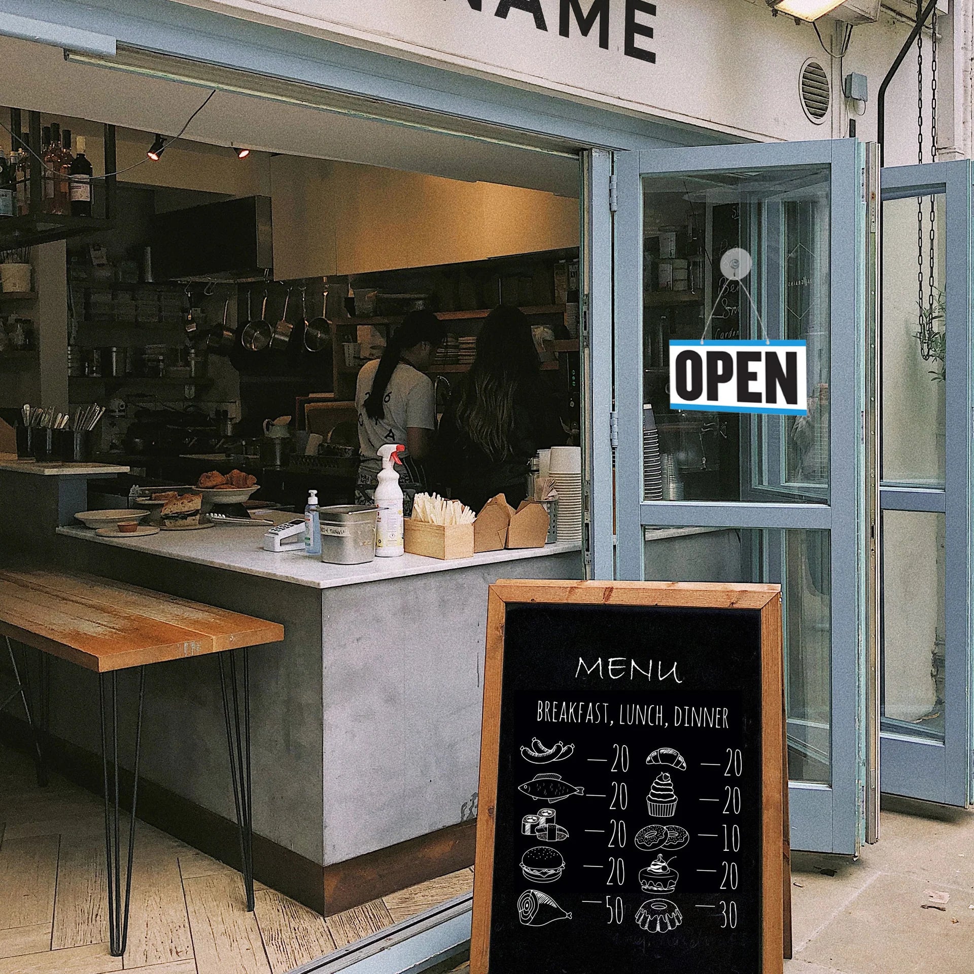- CLOSED & OPEN SIGNAGE. Blue and white background, black text, with red clock's arm. The high contrast lettering ensures high visibility from a distance. Ideal for retail, store, office, school.