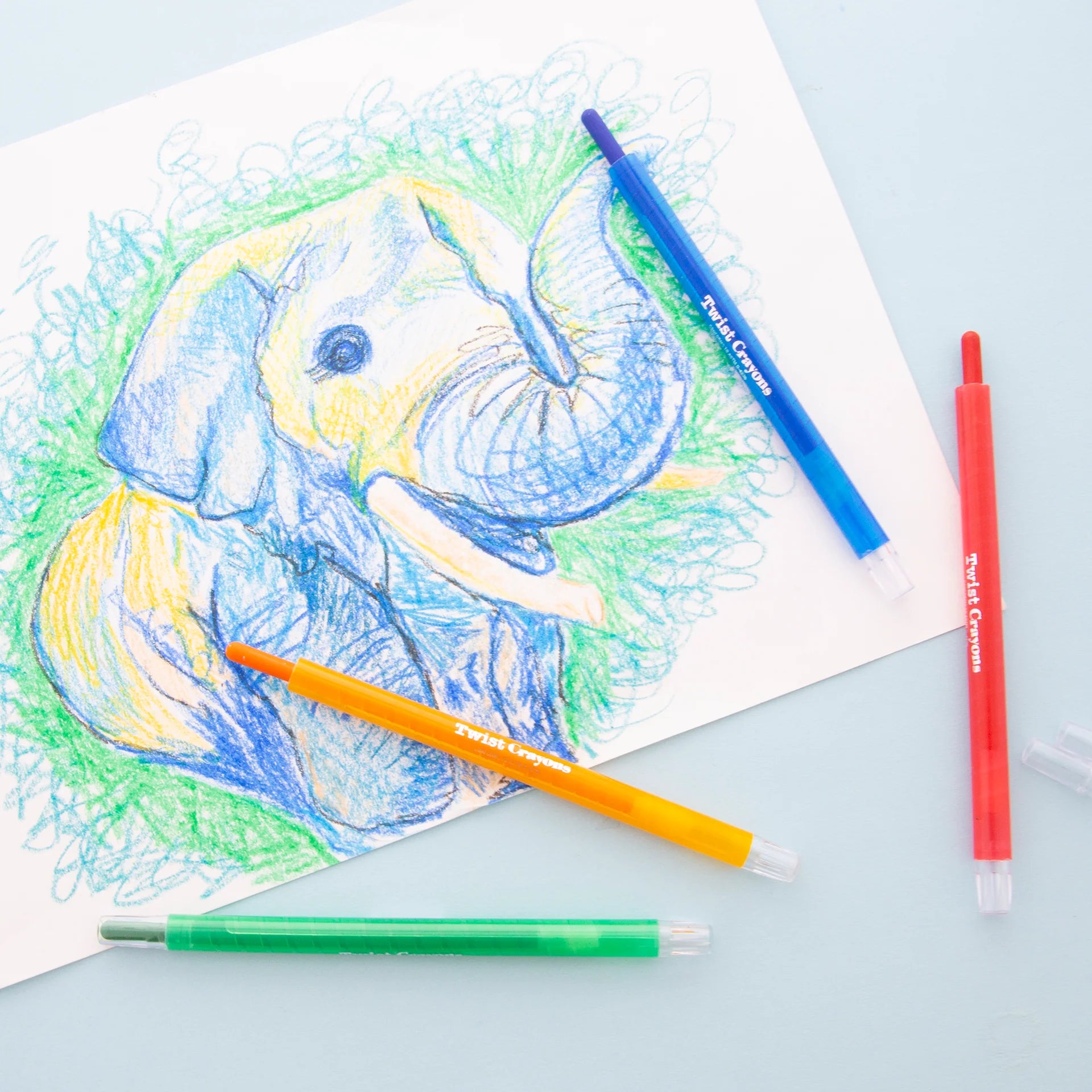 • TWISTY. Twistable pen design never need sharpening or peeling. Simply twist the barrel end and it's ready. Twist up to color, twist down to protect the color core.