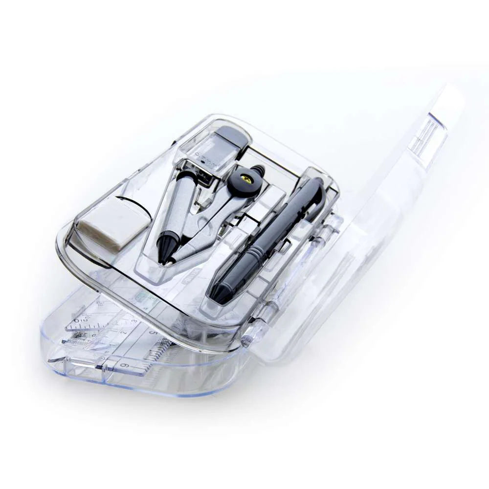 • MATH GEOMETRY KIT 9 PIECES. 180 degree semicircular protractor + 30/60/90 Degree Triangle Ruler+ 45/90 Degree Triangle Rulers + Compass with 0.7 mm mechanical pencil + Lead Fill + Ruler 6" (15 cm) + Eraser + Pen + Portable Transparent Case