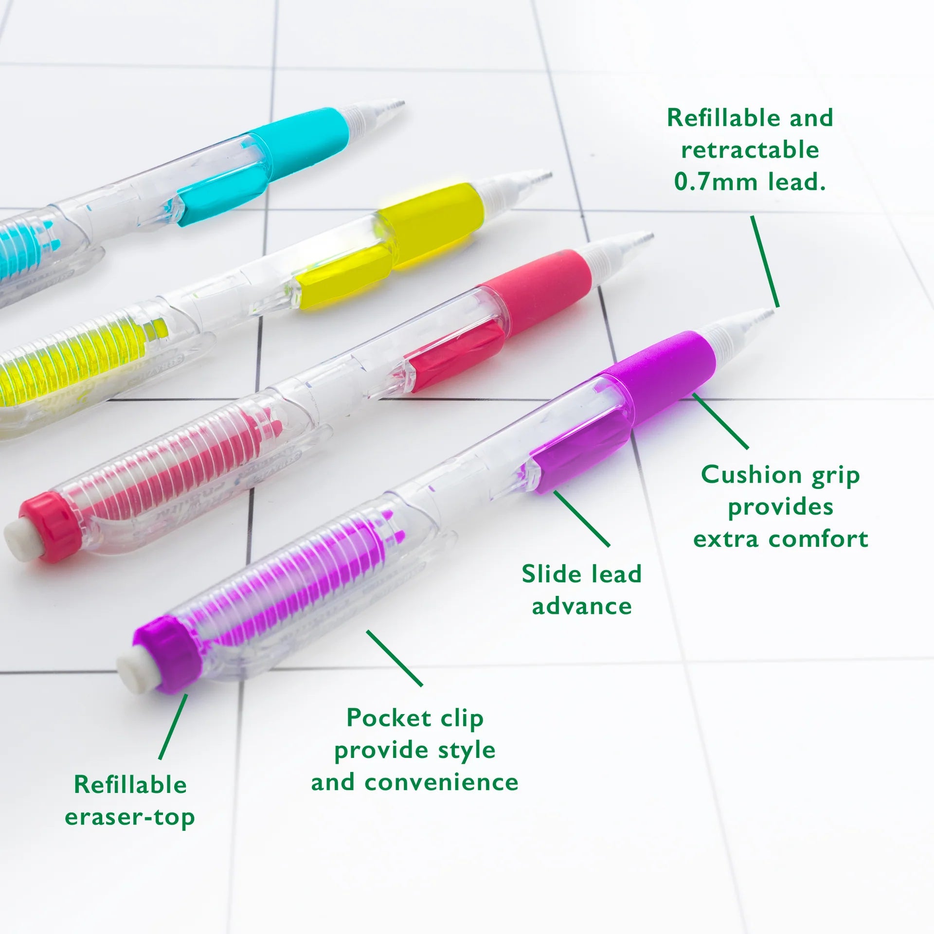 - COLORFUL. Sold in a set of assorted colors, this mechanical pencil adds a vibrant touch to your writing tools. Infuse vibrancy into your writing routine.