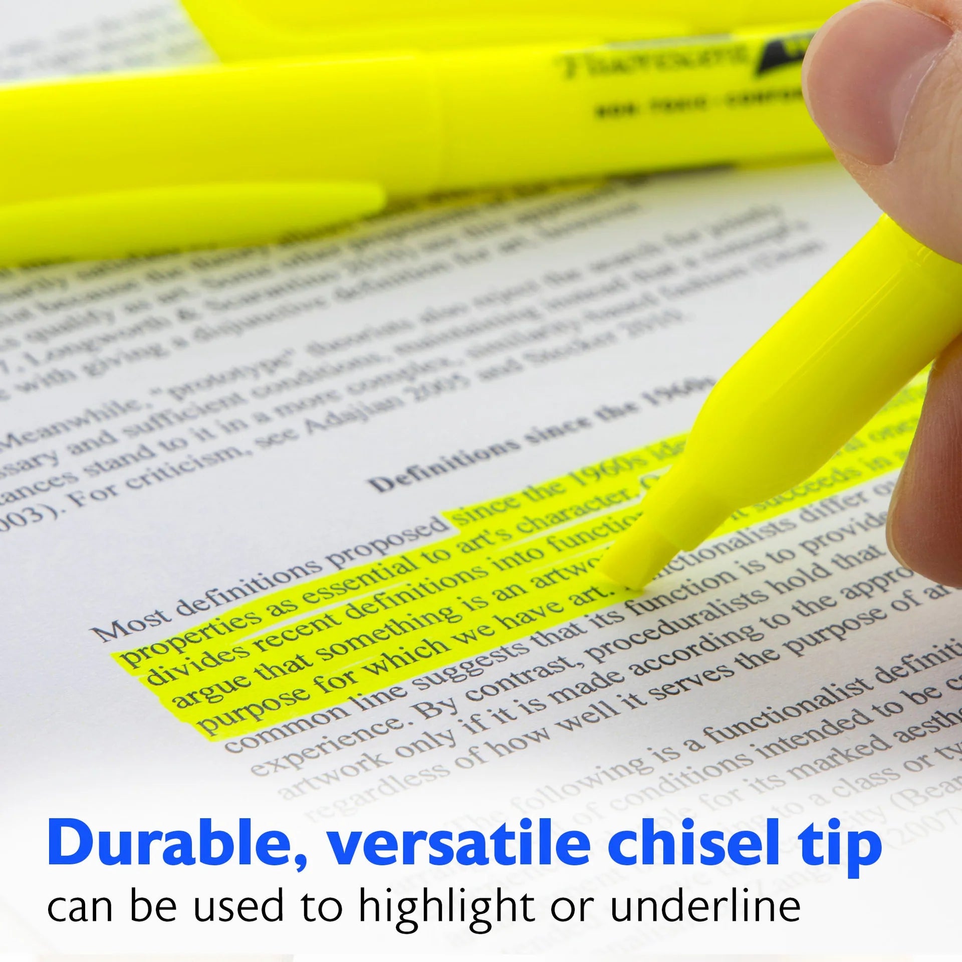 • VERSATILE CHISEL TIP. Highlighter has a molded narrow chisel tip which allows two line widths. Broad-line for highlighting and Fine-line for underlining details with just a twist of the wrist.