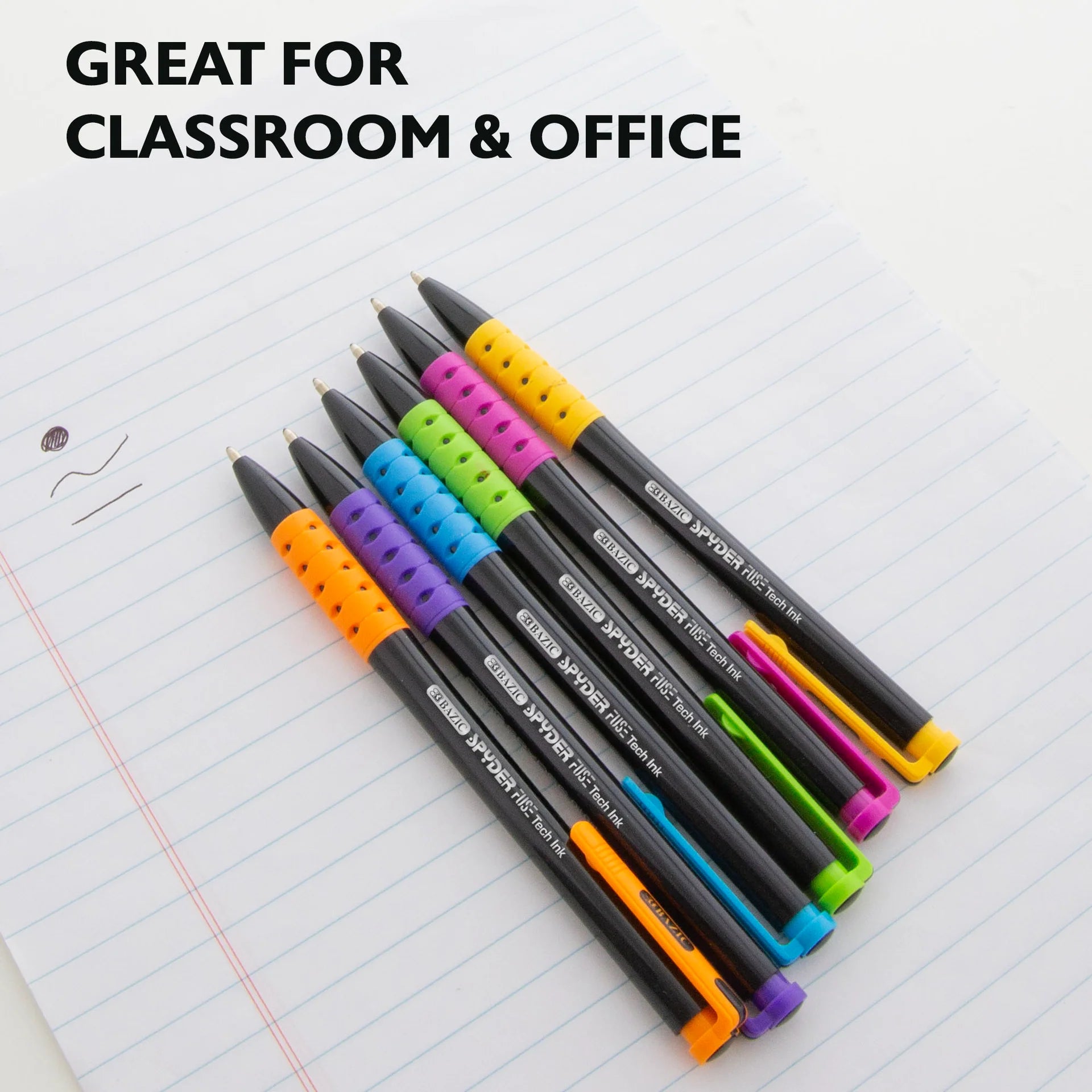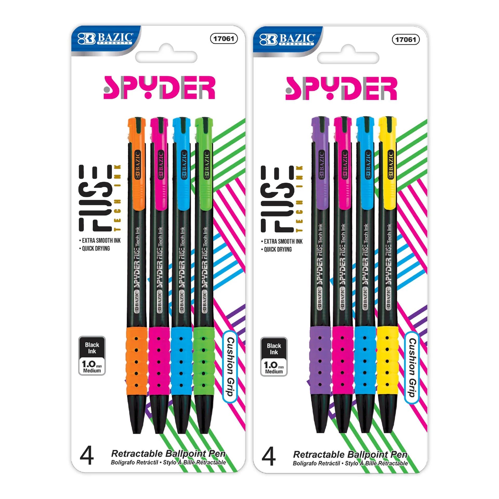 - SPYDER BLACK INK OIL-GEL PENS. Each pack includes 4-Retractable Pens with Black Ink, Barrels come in assorted colors. Actual Colors May Vary! Medium point spreads ink evenly, offering dependable performance.